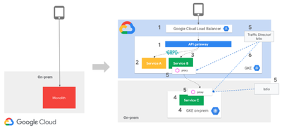 下图是 Google Traffic Director 给出的一个应用改造示例:从单体结构转为微服务架构,从私有云转为公有云加私有云的混合云模式。