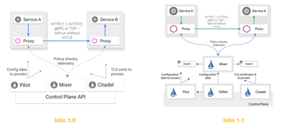 下图是 Istio 1.0 和 Istio 1.1 的架构图对比: