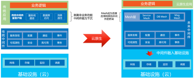 左边是传统的中间件形态,在云原生时代,我们希望将非业务功能从传统中间件的富客户端中剥离出来,然后将这些能力以及这些能力背后的中间件能力,下沉到基础设施,下沉到云。而中间件产品也会融入基础设施,如图中右边所示。未来的中间件将作为基础设施和云的一部分,而 Mesh 则成为连接应用和基础设施以及其他中间件产品的桥梁。