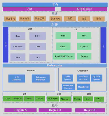 基于 Kubernetes 屏蔽底层的基础设施,支持多机房多Kubernetes集群的应用部署,除了要考虑各种大数据服务如何迁移上云,也要考虑整个平台的易用性,让组件研发无需登录机器进行运维和迁移等操作。同程自研了云舱平台,主要承担这一职责。
