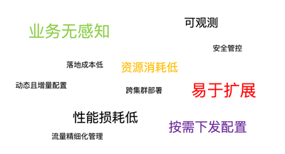 在面对相关业务场景时,我们对于服务网格的要求大概如上图所示,即从资源、性能、流量管理和扩展方向有多个维度的需求。当然除了这些之外,在其他层面也会有一些更细致的要求。比如: