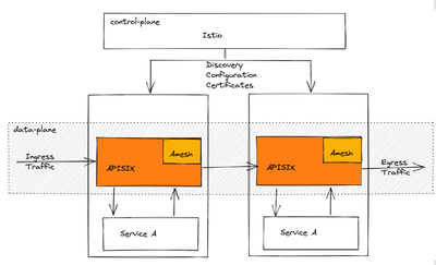 目前这套服务网格方案在架构的选择上,则是采取了控制面 Istio 配合数据面 APISIX 的组成结构。