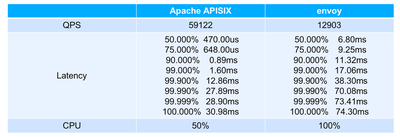 从上图数据可以看出,在 QPS 层面,面对同样的压力和相同机器配置时,APISIX 呈现出了 5 倍的性能提升。同时在请求延迟层面,APISIX 比 Envoy 降低了一个数量级,APISIX 的延迟在微秒级,而 Envoy 在毫秒级别。当然也能看到在这种测下,当 Envoy CPU 已经跑满的情况下,APISIX 的 CPU 消耗才仅为 50%。