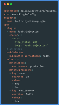 所以就有了自定义 CRD 的出现。比如我们想要做一个故障注入的插件,实际上这个插件在 APISIX 早有提供,因此在这里只需额外配置几个参数即可。当然这里只是拿故障注入插件举例,像 APISIX 中还有安全认证、限流限速等常用插件都可以按照这样的方式接入,从而实现精细化管控。