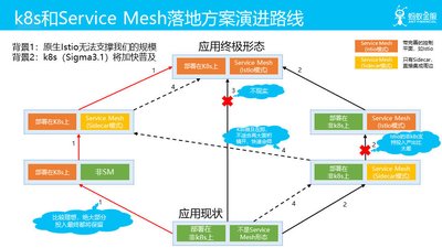 这个图的信息量有点大,描述的是 Service Mesh 和 k8s 落地可能的多种演进路线。