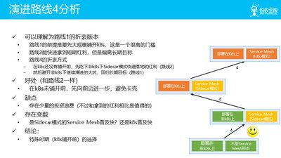 - 还有一条特别的路线 4,走位飘忽,先和路线 2 一样迁移到 Sidecar 模式,然后走回路线 1,上 k8s,再在有 k8s 支持的情况下继续演进到 Istio 模式。
