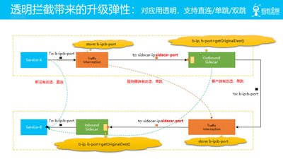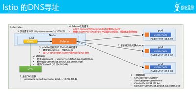 图中描述的是在 Service Mesh 下,客户端通过域名来指定要访问的目标服务,然后通过 DNS 解析机制来串联底层的服务注册/DNS 记录更新/透明劫持传递原始信息/Sidecar 查找路由目标等详细实现机制。