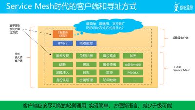 图中我们列举了一个传统的侵入式框架的客户端所包含的功能,在侵入式框架中,大部分的功能都是由客户端实现,因此会包含非常多的功能,如服务发现、负载均衡等基本功能,加密、认证、路由等高级功能。在应用迁移到 Service Mesh 之后,这些功能都下沉到 Service Mesh 中。因此,Service Mesh 下的客户端可以进行大幅度的简化,成为一个新的轻量级客户端。