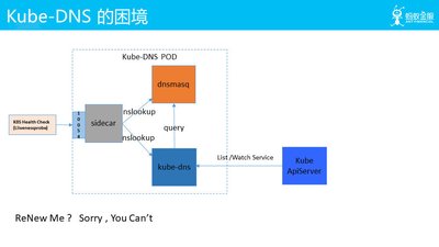 一开始我们 K8S 集群里面是用 Kube-DNS 来做 DNS 寻址的,但我们看这张 Kube-DNS 的架构图。