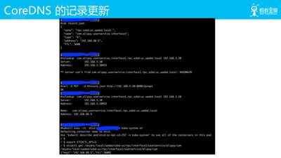 - CoreDNS 社区其实已经把接口实现了,但是后端存储是基于 file 的,数据没有落地。蚂蚁和 UC 这边扩展了 ETCD 插件的接口,把对应 DNS UPDATE 接口给实现了,实现 DNS 数据写入 ETCD 里面。
