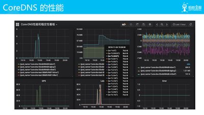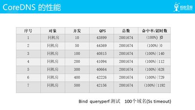 我们把 CoreDNS 的功能开发完了,上线的话很多人关注它的性能。我们这边做了一个简单的性能测试,可以看出 CoreDNS 和 Bind DNS 这种现在比较通用的 DNS 的性能还是有点差距的。