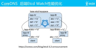 还有如果我们 CoreDNS 的后端变化的更新的 Watch 由于 Watch 的范围过大的话,会返回过多的数据。这样会影响到 Watch 的性能,CoreOS 在 ETCD3.2 增加了 proxy 可以让我们根据不同的 ETCD KeySpace 去 Watch,这样大大的提高了 Watch 的性能。