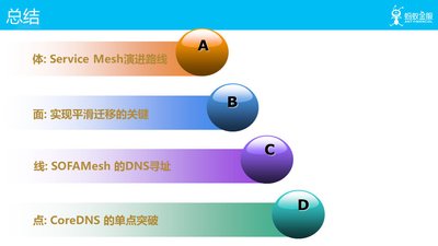 最后我们总结下,总体方面小剑老师给我们讲了蚂蚁金服主站 Service Mesh 的渐进式演进路线和实现平滑迁移的几个关键。具体细节方面我们通过 CoreDNS 的单点突破解决了 SOFAMesh 的 DNS 寻址的问题。