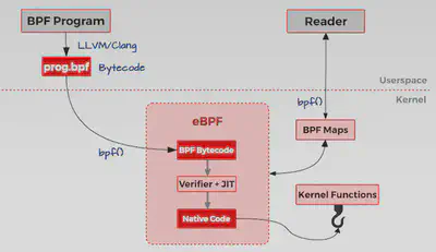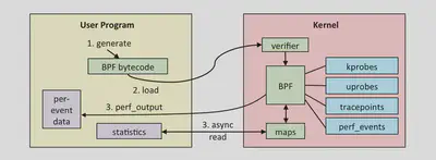- 用户空间程序负责加载 BPF 字节码至内核,如需要也会负责读取内核回传的统计信息或者事件详情;