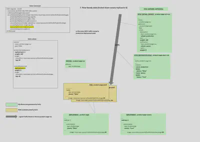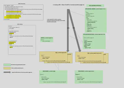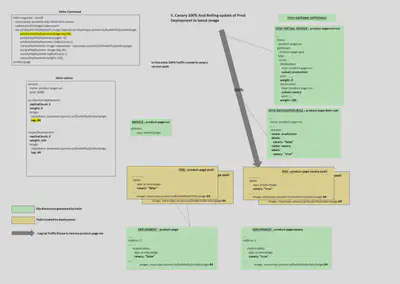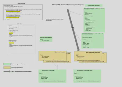 Virtual service 控制着生产版本与金丝雀版本之间的流量分配比例。