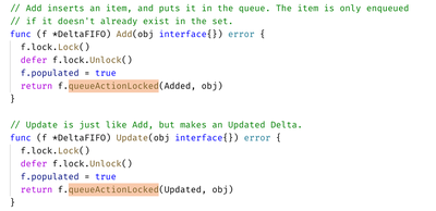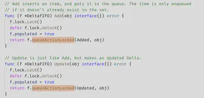 - DeltaFIFO:拆开理解,FIFO 就是一个队列,拥有队列基本方法(ADD,UPDATE,DELETE,LIST,POP,CLOSE 等),Delta 是一个资源对象存储,保存存储对象的消费类型,比如 Added,Updated,Deleted,Sync 等;