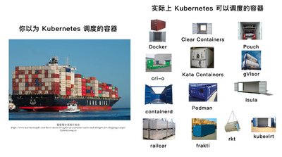 2020 年 Kubernete 宣布将在 v1.20 版本之后弃用 Docker,实际上 Docker 本来就不是 Kubernetes 中默认和唯一的的容器运行时了,实际上只要是支持 CRI(Container Runtime Interface)或 OCI(Open Container Initiative)标准的容器运行时都可以在 Kubernetes 中运行。如下图所示,容器,英文是 container,也是集装箱的意思,其实集装箱不止一种型号,根据运送的货物的不同特性可以制定了多种集装箱类型。而这个容器类型是标准只能是由 Kubernetes 来定,否则只能是削足适履。