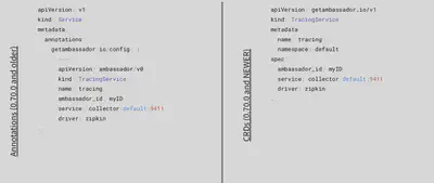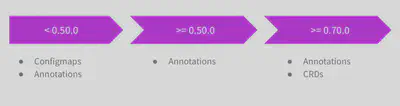 Ambassador 不同版本之间配置方式的变更如下图所示,configmap 方式是早期使用方式,目前已经被废弃了,现在更推荐使用 CRD 方式。