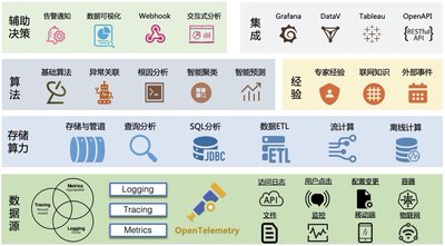 目前我们 SLS 正在开展云原生可观测性的工作,基于 OpenTelemetry 这个未来云原生下可观测性的标准,实现各类可观测性数据的统一收集,覆盖各个数据源和各类数据类型,做到多语言支持、多设备支持、类型统一;向上我们会提供能够支持各类可观测性数据的统一存储和计算能力,支持 PB 级存储、ETL、流计算、百亿级数据秒级分析,为上层算法提供强大的算力支撑;IT 系统的问题非常复杂,尤其涉及到不同的场景和架构,因此我们把算法和经验结合起来进行异常的分析,算法包括基础的统计学、逻辑性算法,也包括 AIOp 相关的算法,经验中包括人工输入的专家知识、网上上积累的各类问题解决方案以及外部产生的一些事件;最上层我们会提供一些辅助决策的功能,例如告警通知、数据可视化、Webhook 等,此外会提供丰富的外部集成能力,例如对接三方的可视化 / 分析 / 告警系统,提供 OpenAPI 以便不同的应用方集成。