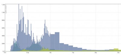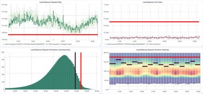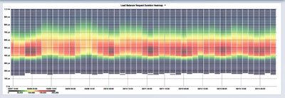 这是一个 heapmap,它代表一组随时间变化的直方图。想象一下,这个热图中的每一列都有一个从上面看的单独的条形图,颜色用于指示每个间隔的高度。这是来自 10 个负载均衡器集群的响应延迟的 grafana 可视化。这使我们能够深入了解整个集群的系统行为,一周之内就有超过 100 万个数据样本。这里的中位数大约在 500 微秒左右,以红色带表示。