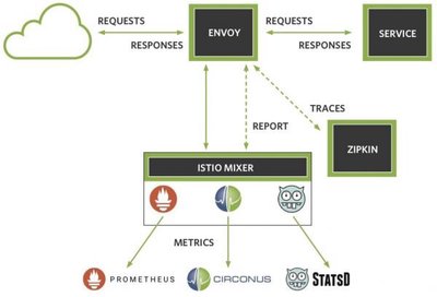 上图显示了服务网格架构。Istio 为每项服务部署了一个 envoy sidecar proxy。Envoy 通过 gRPC 调用代理到 Istio Mixer 服务的入站请求。然后,Mixer 应用流量管理规则,并联合请求遥测。Mixer 是 Istio 的大脑。运维人员可以编写 YAML 文件来控制 Envoy 如何重定向流量。他们还可以指定监测信息推送和可观测性系统的遥测技术。可以在运行时根据需要应用规则,而无需重新启动任何 Istio 组件。