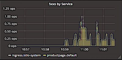 Istio 仪表板为返回 5xx 错误代码的响应做了类似的操作。在上面的屏幕截图中,您可以看到它如何通过 ingress controller 或 productpage 页面本身的错误来分解错误。