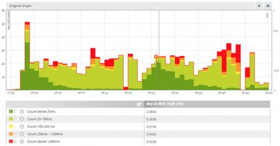 上面的可视化显示延迟分布随着时间的推移被延迟带分解。这里的频段显示 25ms 到 100ms,100-250ms,250-1000 和 1000ms 以下的请求数。快速的请求分组以绿色显示,请求速度的请求变慢以红色显示。
