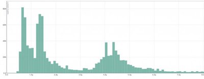 该直方图显示具有两种不同模式的分布。最左边的模式可能是由于缓存服务而产生的快速响应,以及来自磁盘的正确模式。仅仅使用四个百分点来衡量延迟就几乎不可能辨别出这样的分布。这给了我们一个百分点可以掩盖的复杂性的感觉。考虑具有两种以上模式的分布: