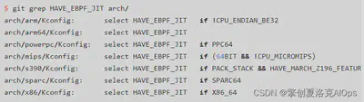 要判断哪些平台支持 eBPF JIT,可以在内核源文件中 grep HAVE_EBPF_JIT: