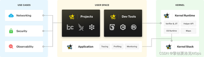 eBPF 从根本上改变了这个现象。通过在操作系统内运行受沙盒保护的程序,应用开发人员可以在运行时运行 eBPF 程序,为操作系统添加额外的功能。操作系统会利用即时编译器和验证引擎的帮助来保证安全性和执行效率,就像本地编译一样。这导致了一系列基于 eBPF 的项目的涌现,涵盖了各种用例,包括下一代网络、可观测性和安全功能。
