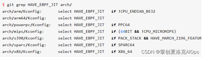 要判断哪些平台支持 eBPF JIT,可以在内核源文件中 grep HAVE_EBPF_JIT: