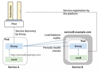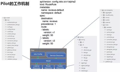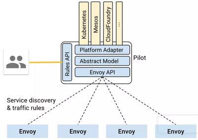Pilot 最上面一层称为 Platform Adapter,这一层是干什么的呢?这一层不是 Kubernetes, Mesos 调用 Pilot,而是 Pilot 通过调用 Kubernetes 来发现服务之间的关系。
