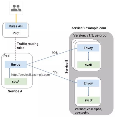 常见的一种人工规则是 Routes,通过服务发现,Pilot 可以从 Kubernetes 那里知道 Service B 有两个版本,一般是两个 Deployment,属于同一个 Service,管理员通过调用 Pilot 的 Rules API,来设置两个版本之间的 Route 规则,一个占 99% 的流量,一个占 1% 的流量,这两方面信息形成 Pilot 的数据结构模型,然后通过 Envoy API 下发,Envoy 就会根据这个规则设置转发策略了。