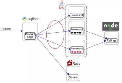 在这个例子中,我们重点关注 ProductPage 这个服务,对 Reviews 服务的调用,这里涉及到路由策略和负载均衡。