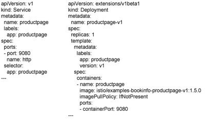 首先定义了一个 Deployment,使用 bookinfo 的容器镜像,然后定义一个 Service,用于这个 Deployment 的服务发现。