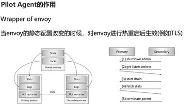 这就是 pilot-agent 的作用,他是 envoy 的一个简单的管理器,因为有些静态资源,如果 TLS 的证书,envoy 还不支持动态下发,因而需要重新静态配置,然后 pilot-agent 负责将 envoy 进行热重启加载。