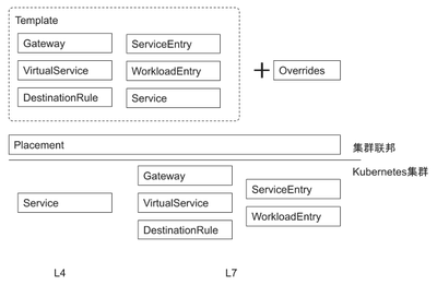 Kubernetes 通过集群联邦实现多集群的管理,我们基于集群联邦实现了一套 Federated AccessPoint,其核心是将 Kubernetes 中描述负载均衡的 Service 对象和 Istio 中描述网络流量的 Gateway、VirtualService、DestinationRule、ServiceEntry、WorkloadEntry 等对象定义为模板,将 AvailabilityZone 或者 Kubernetes Cluster 作为部署目标,并且支持 Override 属性的集群联邦对象。