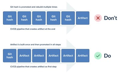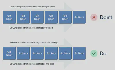 其次,它破坏了先前的规则。在每个管道步骤中重新编译代码提交,留下了造成不同于之前的工件的空间。你失去了在生产中部署的确切内容与管道中测试的确切内容相同的保证。