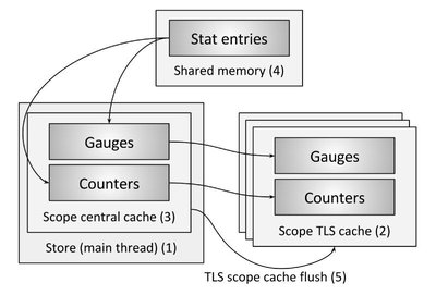 - 统计数据包含在一个作用域内,可以作为一个组释放,也可以重叠:作用域具有完全独立的中央缓存和 TLS 缓存,以及独立的每个统计数据引用计数。一个作用域可以被移除,并且它的所有统计数据的引用计数将会减少,并且可能会被释放。