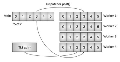 - 主线程可以将任意数据设置到其槽中。完成此操作后,数据将作为正常事件循环事件发布到每个工作程序中。