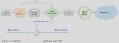 将 Git 作为交付流水线的核心,每个开发人员都可以提交拉取请求(Pull Request)并使用 Git 来加速和简化 Kubernetes 的应用程序部署和运维任务。通过使用像 Git 这样的简单熟悉工具,开发人员可以更高效地将注意力集中在创建新功能而不是运维相关任务上。