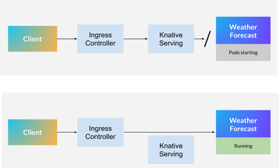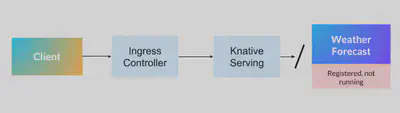 现在,通过 Knative 的视角,让我们考虑下面的示例:有如下一个场景,客户端希望从一个在 Knative 平台上注册但不一定立即运行的应用程序中检索天气预报信息。使用 Knative 术语,有一个服务可以创建必要的配置和路由,以便在调用天气预报应用程序时运行它。在 Knative 上下文中,应用程序包括: