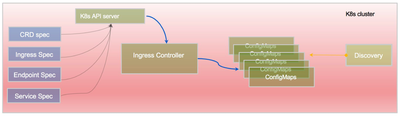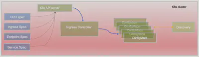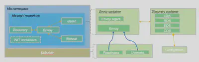 当eBay 为他们的 Envoy 部署构建了控制平面时,他们还将控制平面 (discovery pieces) 的部分组件与数据平面联合部署。他们基本上自己实现了一个控制器来监视 CRD、Ingress 和服务资源,并且生成配置映射。然后,这些配置映射将由与 Pod 一起运行的discovery容器使用,并随着改动重新热启动,以及更新 Envoy。