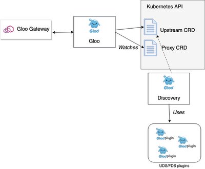 Gloo 控制平面中的discovery组件仅使用其 UDS 和 FDS 服务来发现Upstream对象并将其写入 Kuberentes CRDs。从这里,用户可以创建从 Envoy 代理上的特定 API 路径到Upstream上的特定函数的路由规则。Envoy 代理不直接与这个控制平面组件交互 (请回忆一下,Envoy 只使用gloo组件公开的 xDS API)。相反,discovery组件促进了向Upstream的创建,然后可以由Proxy对象使用。这是一个使用支持微服务 (本例中的discovery服务) 来为控制平面的整体功能做出贡献的好例子。