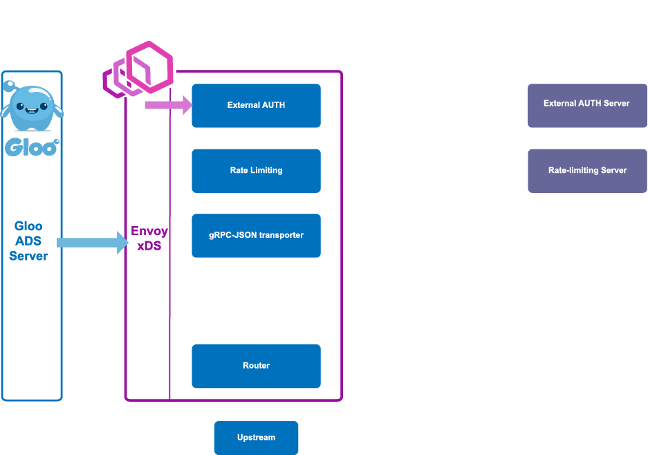 您可以看到Proxy对象指定监听器、类型以及路由信息。如果您仔细观察,您会发现它在一定程度上遵循 Envoy 的配置,但在支持附加功能方面有所不同。在路由中,您可以看到请求被发送到“Upstream”。Gloo 知道如何路由到Upstream,您可以在上面的Proxy对象中看到这些定义。Proxy对象是由 Gloo 的控制平面转换为 Envoy xDS API 的对象。您会看到如下的 Gloo 的组件: