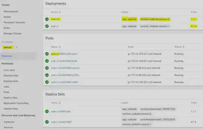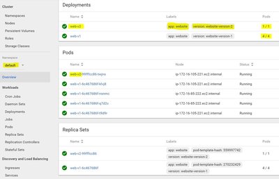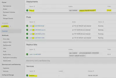 保存并退出文件编辑模式以应用修改后的资源。测试一下。在这个阶段,我们仍然可以加载网站,并刷新几次。现在,使用“kubectl create -f version-2-deployment.yaml”部署“version-2”并在仪表板中检查结果: