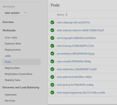 安装完成后,你能在你的 kubernetes dashboard 的左侧边栏 pods 中查看已部署的 istio 组件。如下图所示: