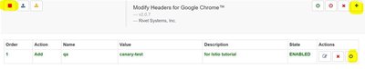 单击右上角的“加号”添加标题,填写名称和值,选择“添加”操作,然后单击“保存”。单击左上角的“开始播放”按钮(在我们的屏幕截图上显示“停止”的那个,因为它已经处于活动状态)。然后单击右侧规则“操作”部分中的“激活”按钮。使用此设置,再次加载入口页面以查看“version-2”蓝页!