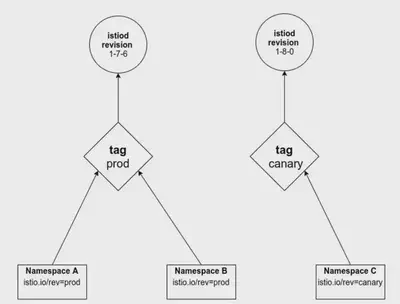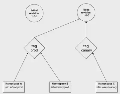有了修订版标签,现在有了一个间接层:你可以创建像 canary 和 prod 这样的标签,把使用这些标签的命名空间标记为修订版(即 istio.io/rev=prod),并把特定的 Istiod 修订版与该标签联系起来。