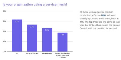 根据 CNCF 2020 年调查,46% 的组织在生产中使用服务网格或计划在未来 12 个月内使用。Istio 是在生产中使用的最多的网格。